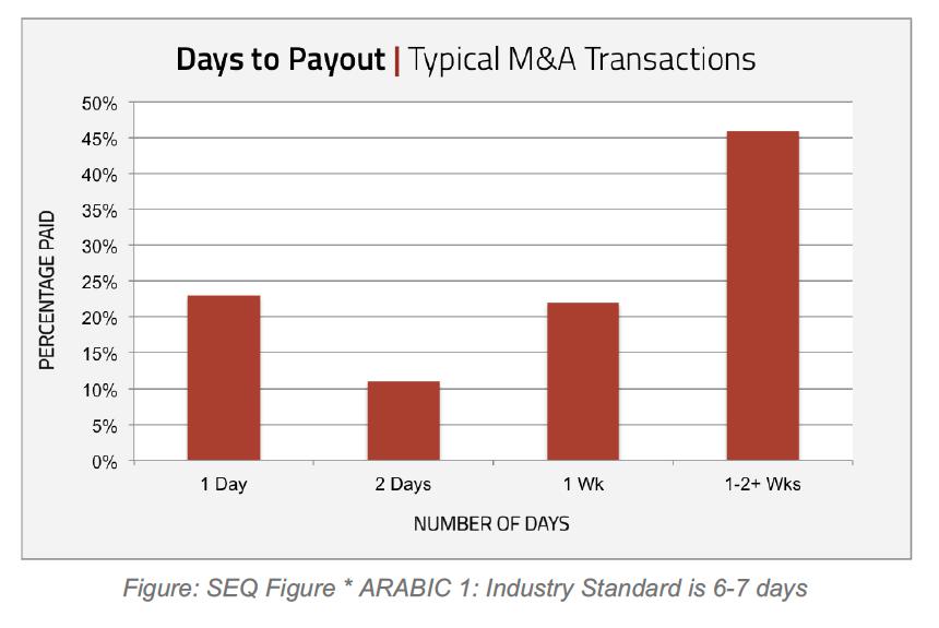 Everyone understands that it would be better to get paid as soon as possible, but many deal professionals simply assume it takes a week or two to effect payments following the closing of an M&A transaction or the expiration of an escrow. Most investors are looking to realize a 20% or higher internal rate of return on investments in private companies, so the cost of capital is high4. Assuming annual cash payments of $1,500B, then each day that M&A payments are delayed costs the industry over $800M. According to SRS Acquiom data, the average time for banks to pay closing consideration has been six days. That means that the value to investors of eliminating this delay is approximately $4.9B per year — a huge opportunity cost that warrants serious attention.