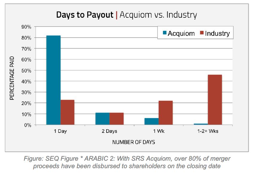 error-prone and a needless waste of time and money. By moving M&A payment administration online, SRS Acquiom Clearinghouse eliminates transcription errors, and the whole process is streamlined with simple, more intuitive forms. The result is faster payments to shareholders and no hassle for acquiring companies. To date, over 80% of merger consideration has been paid the day of closing:5