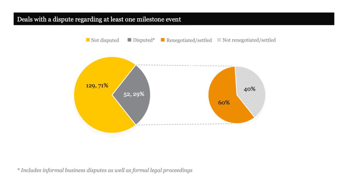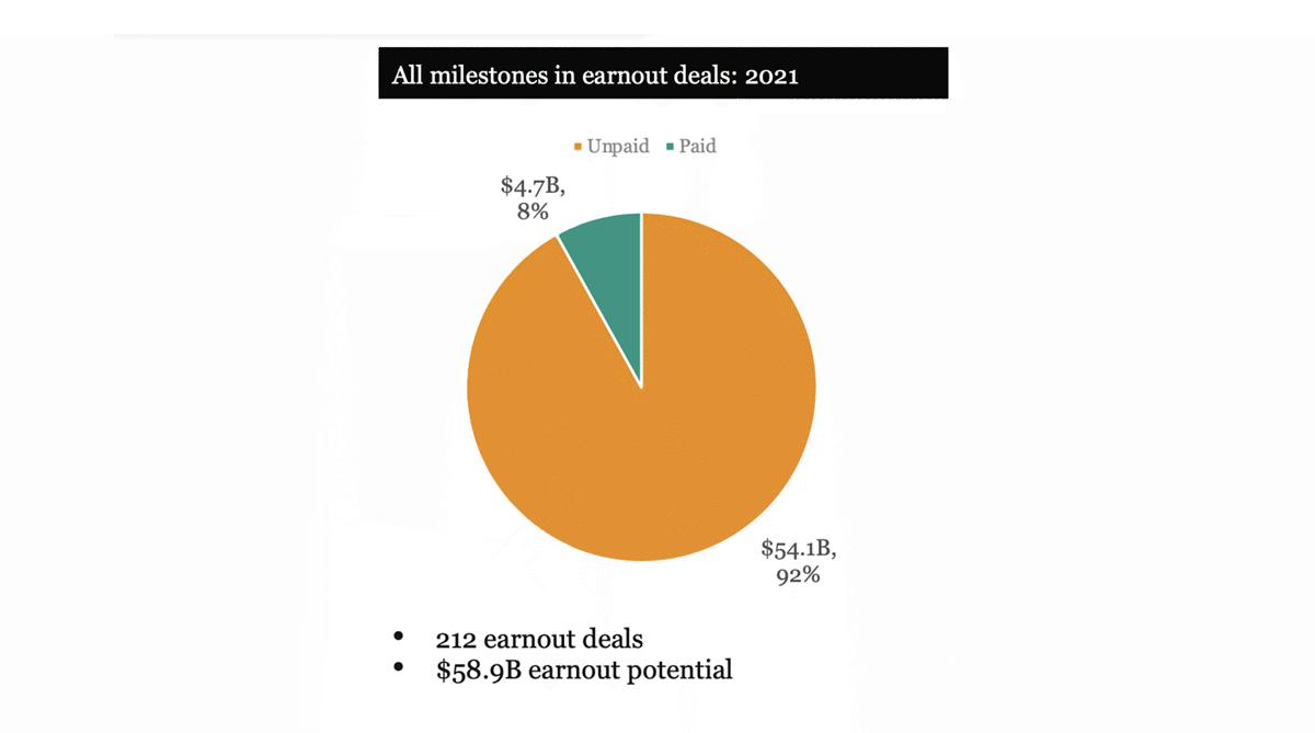 As buyers seek earlier-stage companies and market conditions continue to create uncertainty, contingent consideration is gaining significance in life sciences M&A dealmaking. Milestone tables are getting larger with very large milestones added to later years, but actual achievement is often delayed. The SRS Acquiom 2021 Life Sciences M&A Deal Terms Study data showed that $54.1 billion in milestone achievements were potentially available, but only a fraction of that amount ($4.7 billion) was earned. These larger and longer milestone periods increase the possibility of a dispute.