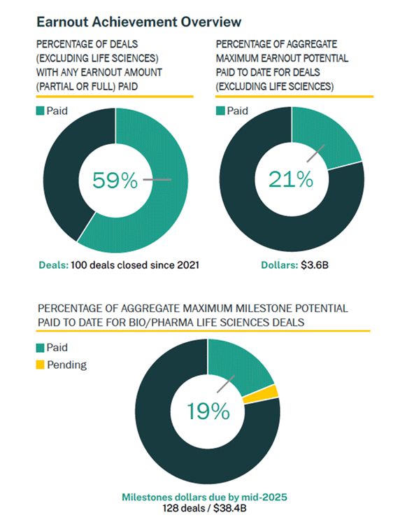 - In bio/pharma M&A specifically, only a small fraction of earnout dollars (19 cents on the dollar) are ever paid.