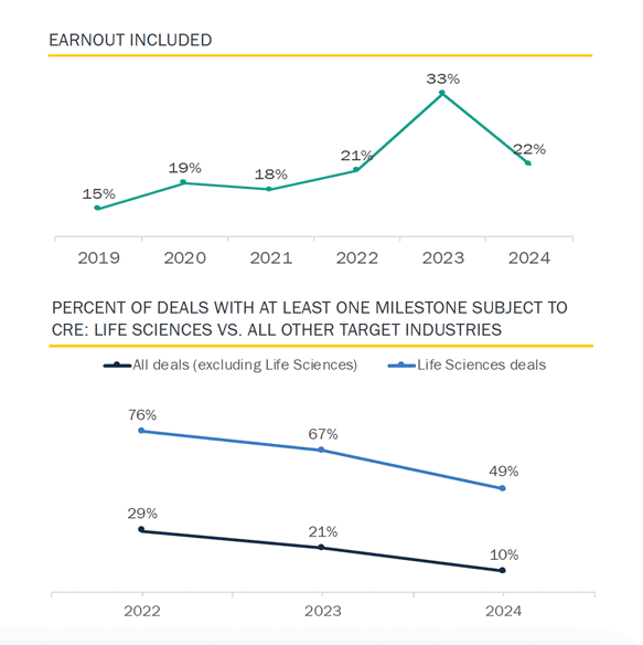The majority of M&A deals do not include an earnout, and for those that do, most of the dollars at play never get paid. Nevertheless, earnouts can be an effective means to get a deal done, and we continue to see a slightly heightened use of earnouts following a spike in 2023. For some industries, such as life sciences, an earnout structure can even be a necessity.